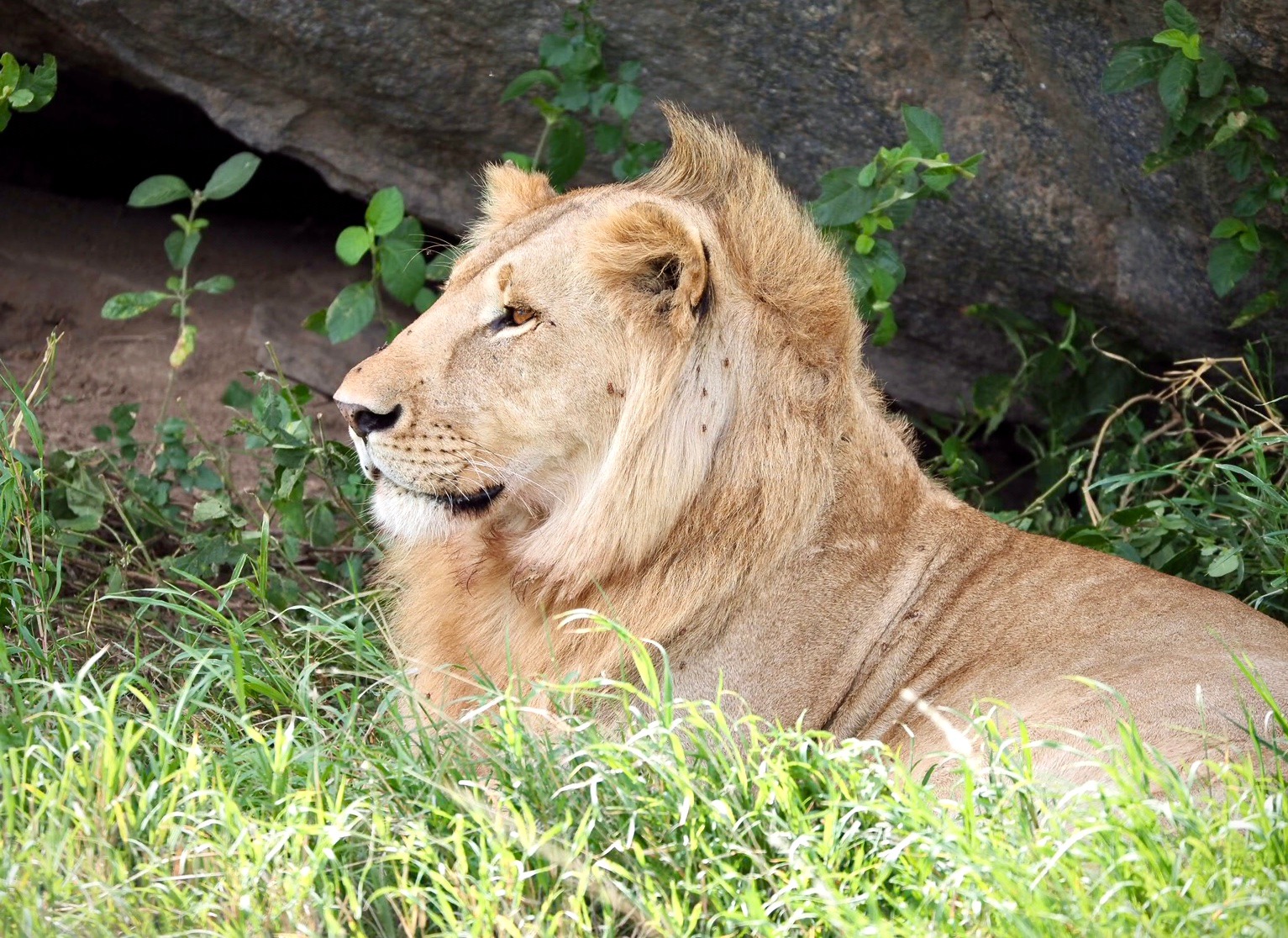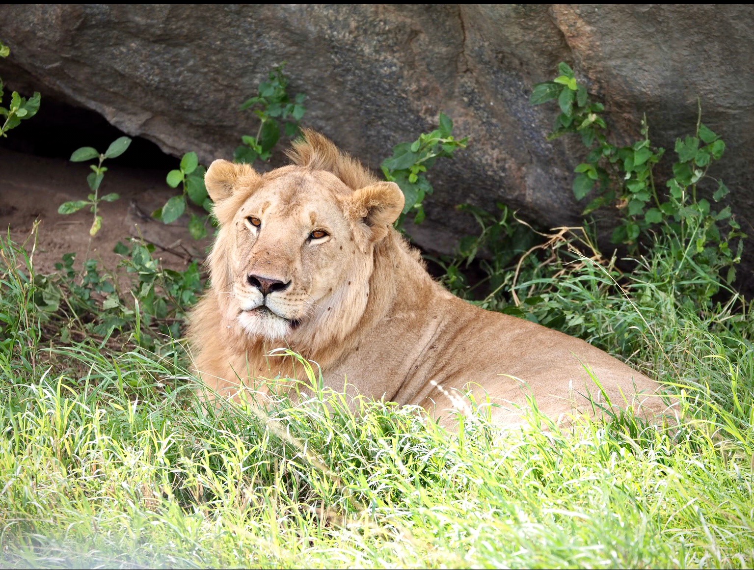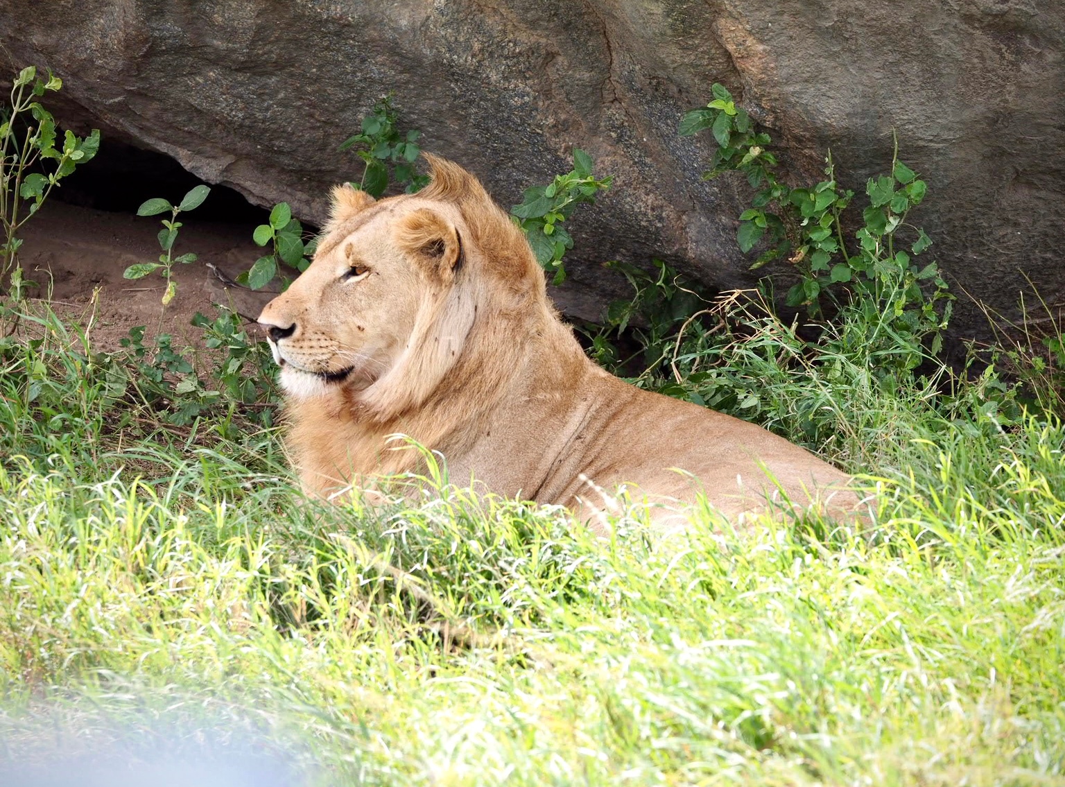 広い広いセレンゲティの中でも、ライオンが好んで休む場所があります。いないことも多いのですが、この日は運良く、雄のライオンが休憩をしていました。私から見ると、とってもハンサムですが、ライオンの世界では、立髪が黒くてフサフサしている方がモテるようです。