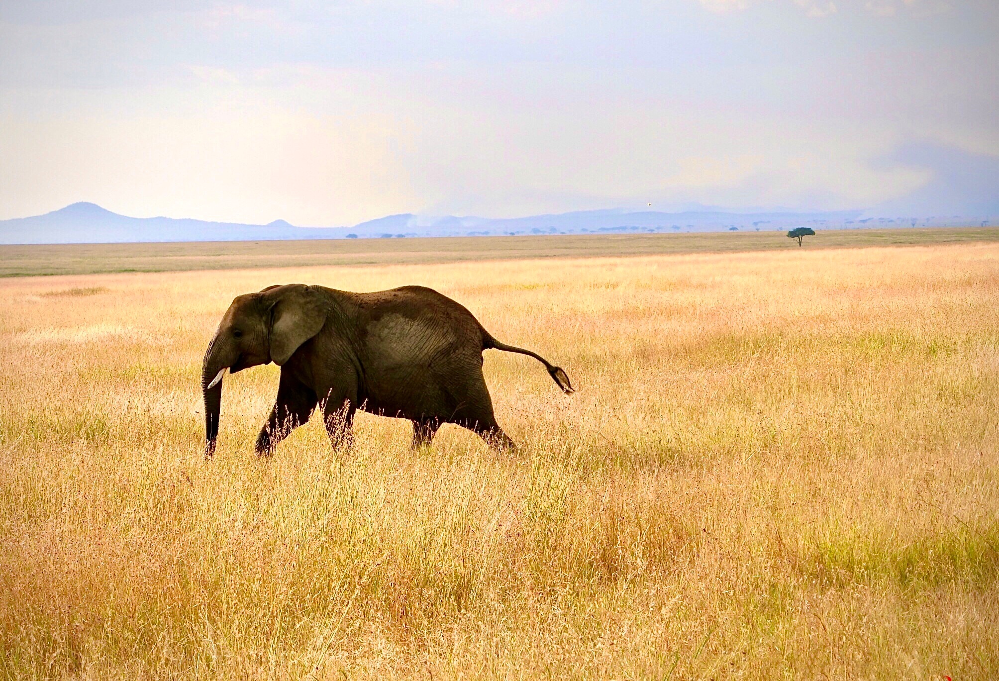 初めてのタンザニア、遠くに見える黒い点はアフリカゾウです。目の前を象が横切る感動 ! 夢中でシャッターを押し続け、後で生で見れば良かったと後悔。ドライバーの方は、この時間にここを象が通ることを分かっていたようです。本当に感謝 ! この画像は3月末です。