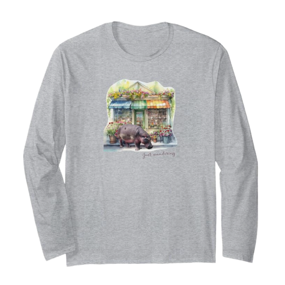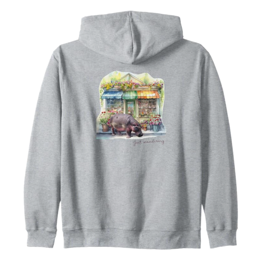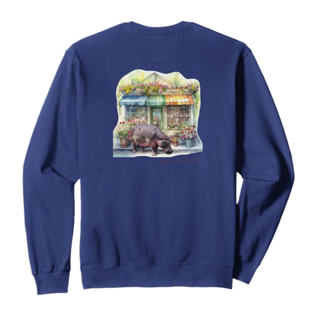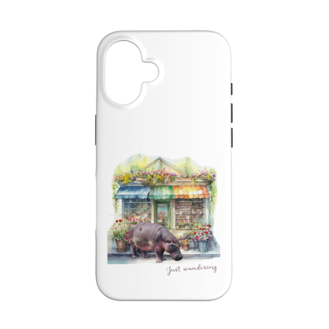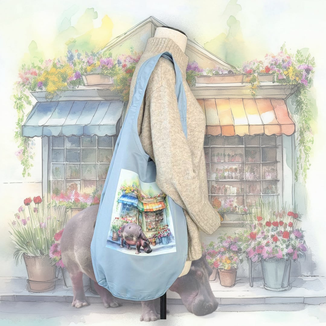フラワーショップの前に立っているカバのデザインが、日常のお買い物に楽しいアクセントを加えます!大人気の「MOTTERU」エコバッグシリーズの新作として、マルシェバッグは特にお買い物に最適です。