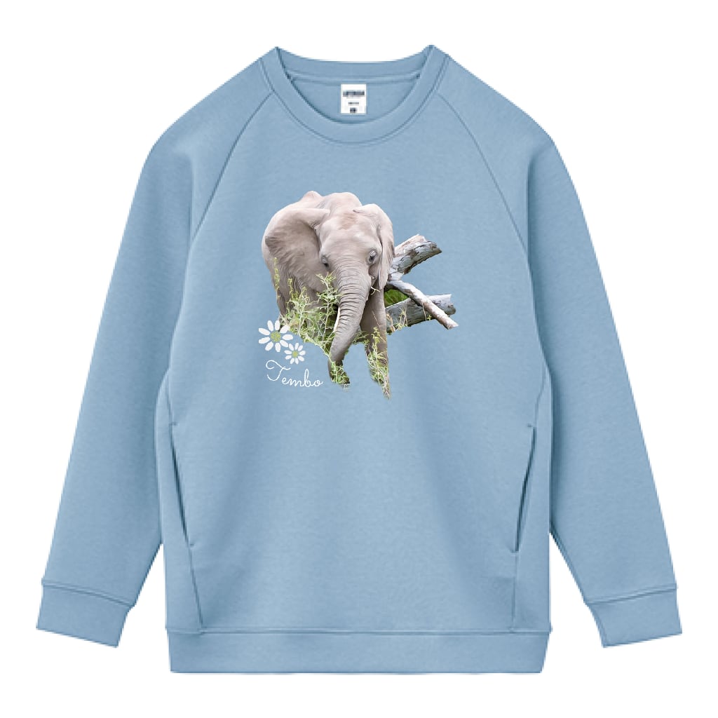 スモーキーブルーの柔らかいトーンが落ち着きを与え、アフリカゾウのデザインがさりげない個性を演出します。このトレーナーを着ることで、普段のコーディネートが一層魅力的になることでしょう♪