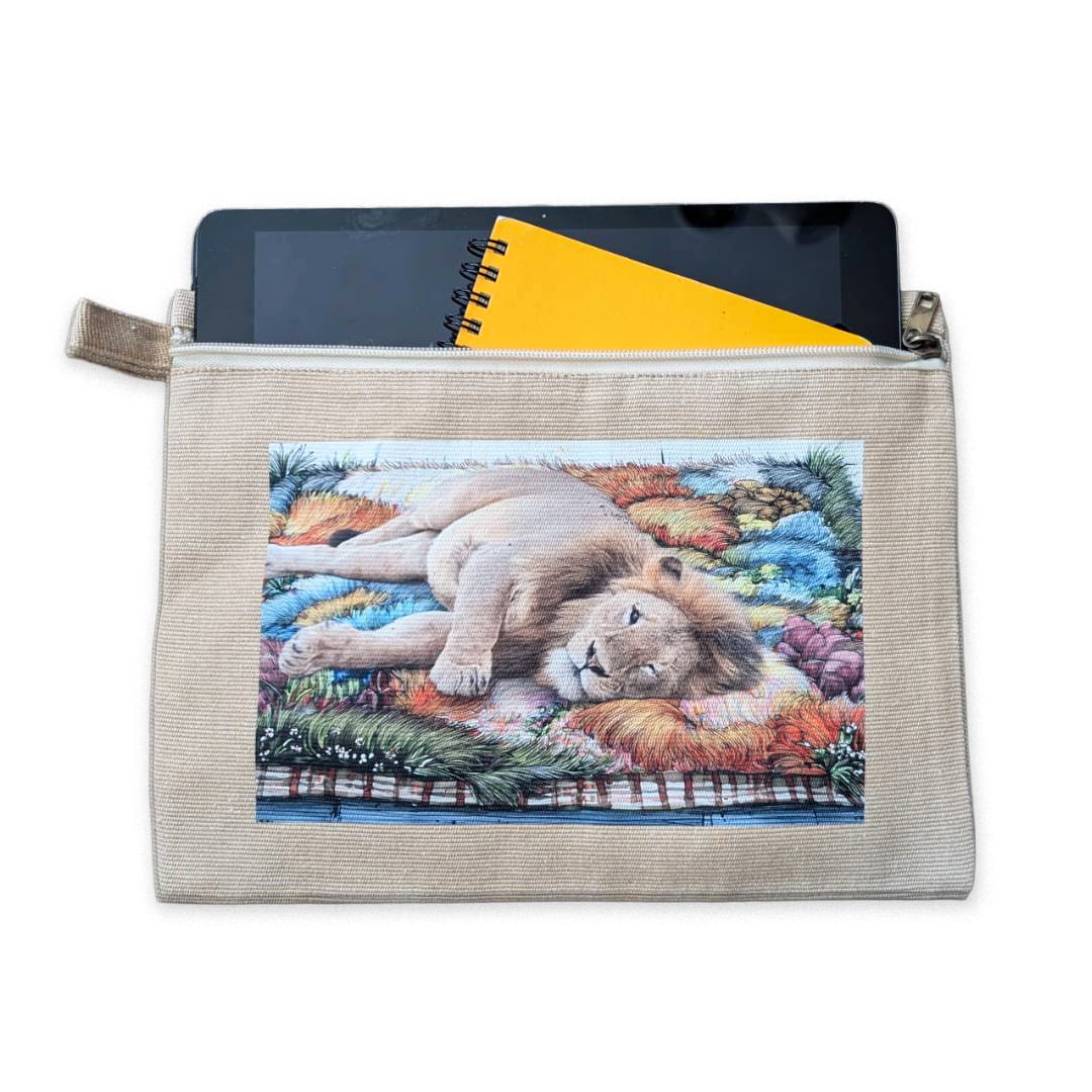 柔らかなベージュにライオンのデザインが映えるこのフラットポーチは、あなたの日常に優雅さを添えるアイテムです!新しくラインアップされたシャンブリックキャンバスフラットポーチは、機能性と独自のデザインを兼ね備えた逸品です。