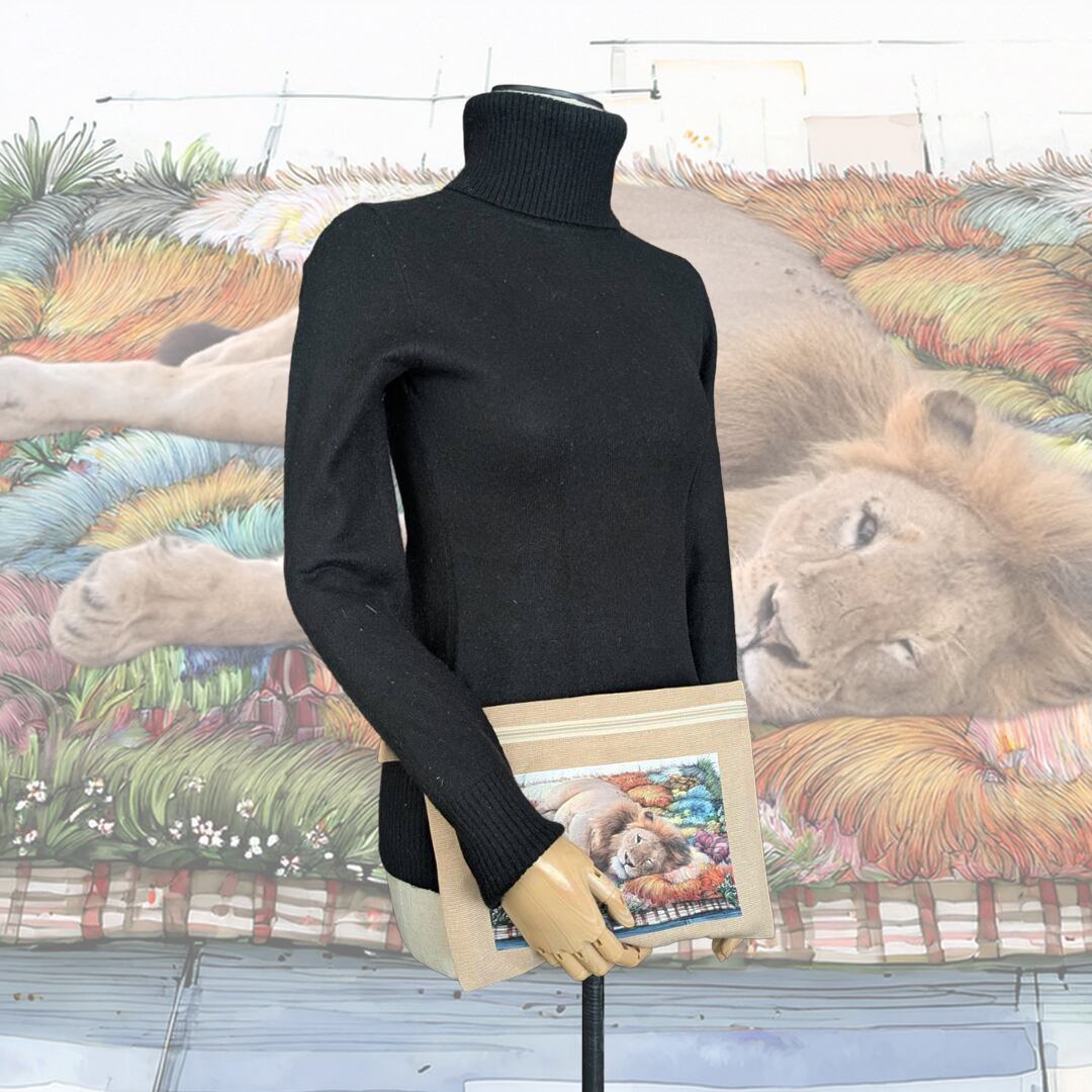 落ち着いたベージュ地に華やかに映えるライオンが、使うたびに心を豊かにしてくれるポイントに。このポーチは、化粧品や小物を持ち運ぶだけでなく、普段のコーディネートにさりげないアクセントを加え、あなたの個性を引き立てます♪