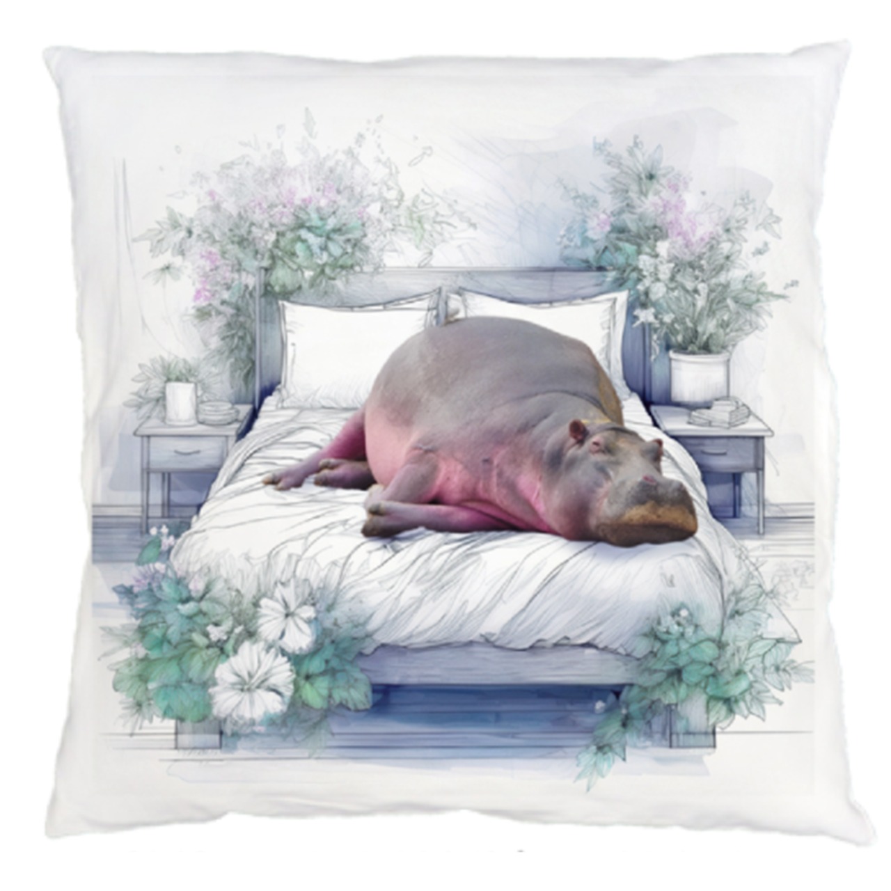 **【日本製】 角型クッションカバー ベッドで寝ているカバ**