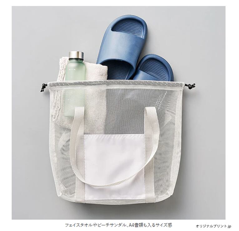 Lサイズの収納スペースは、普段使いの荷物をしっかりと収めます。また、前ポケットも付いており、携帯やハンカチなどをすっきり整理できます。また、メッシュ素材を使用しているため、通気性も良く、使いやすさが抜群です。さまざまなシーンで活躍するトートバッグとして、ぜひお試しください!