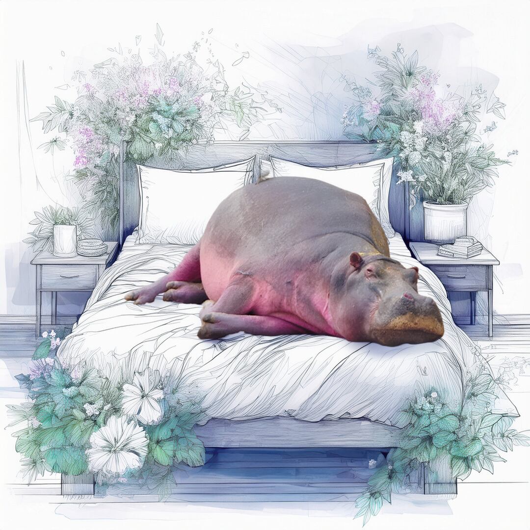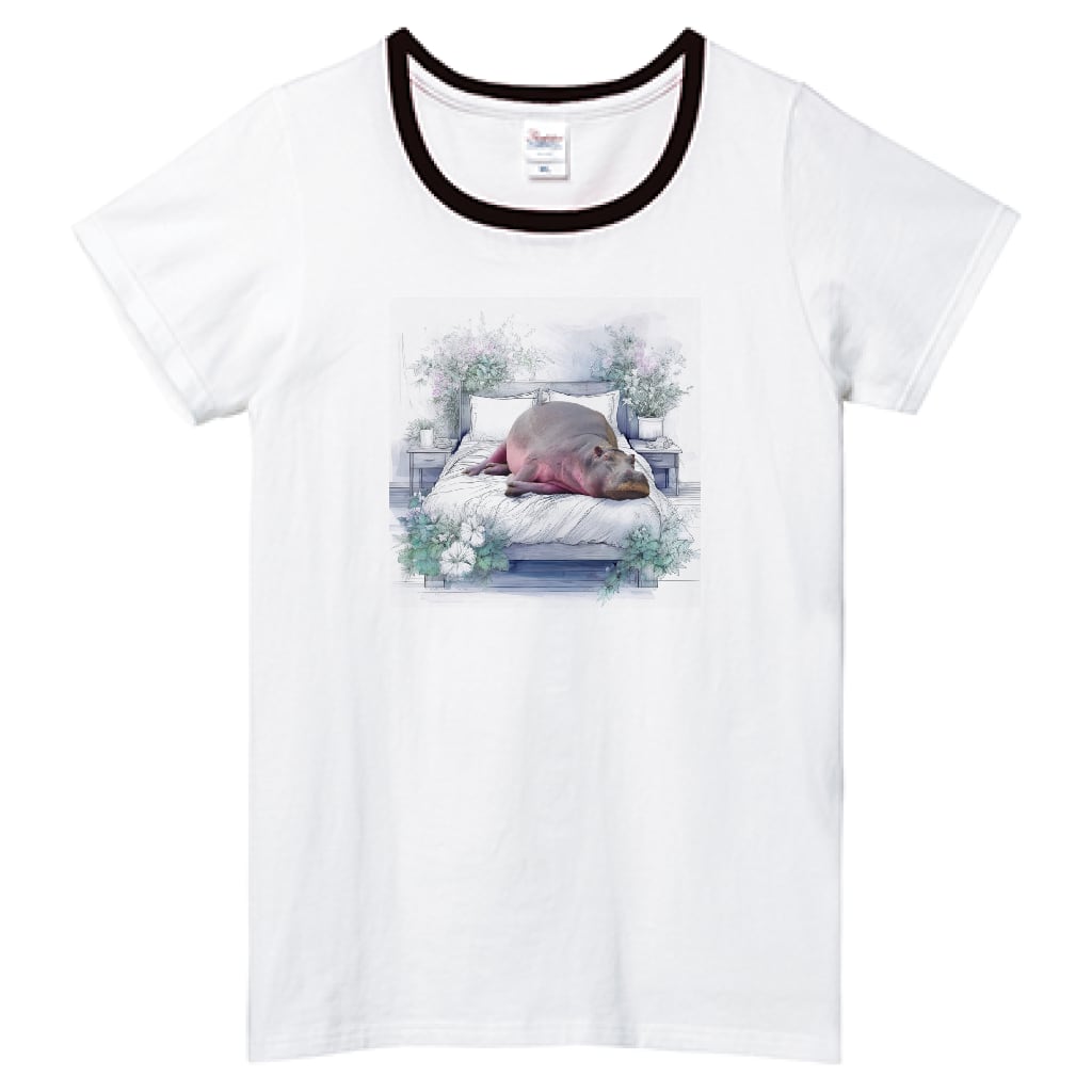 **Printstar ヘビーウェイトTシャツ (レディース) ブラック x ホワイト ベッドで寝ているカバ**