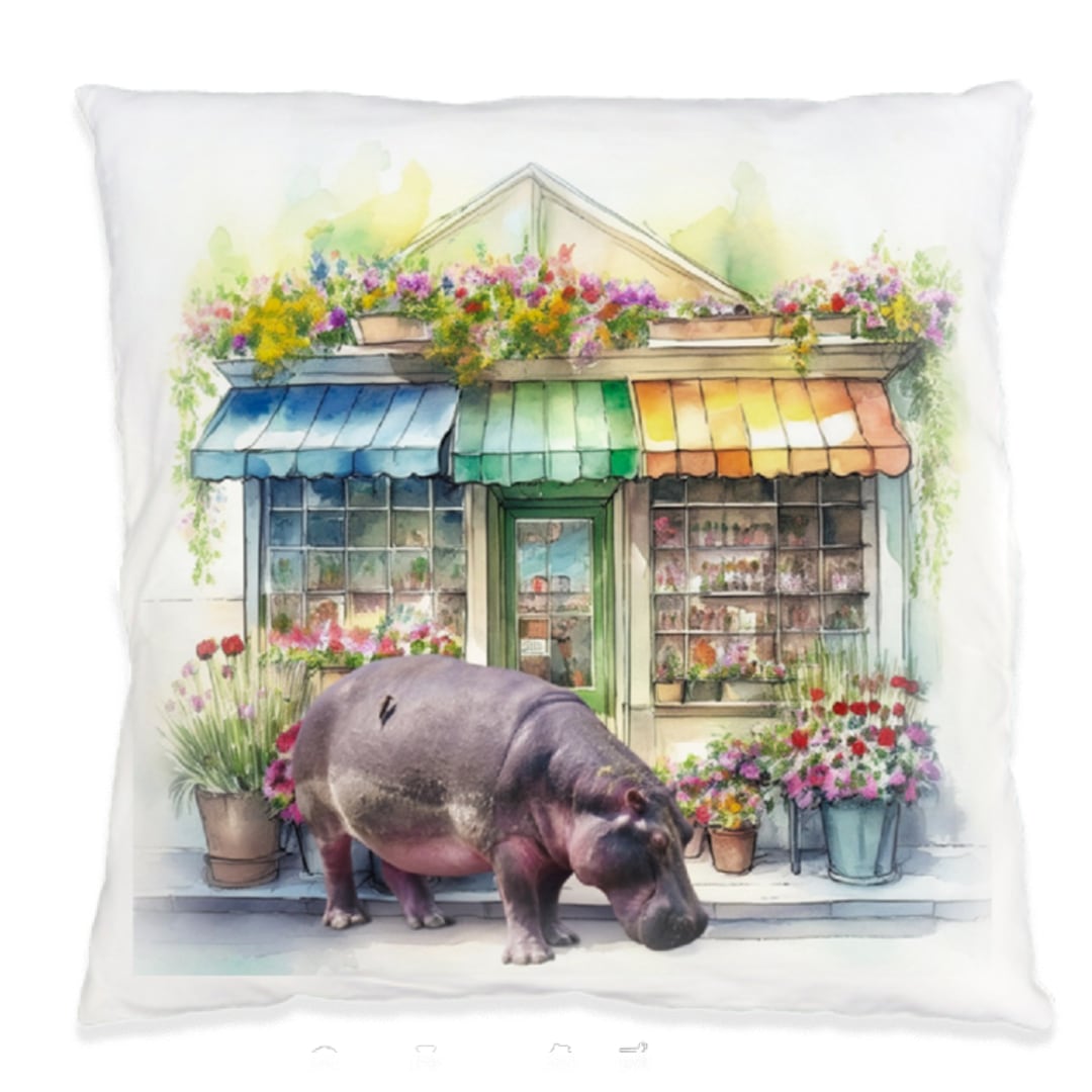 **角型クッションカバー フラワーショップの前に立っているカバ**