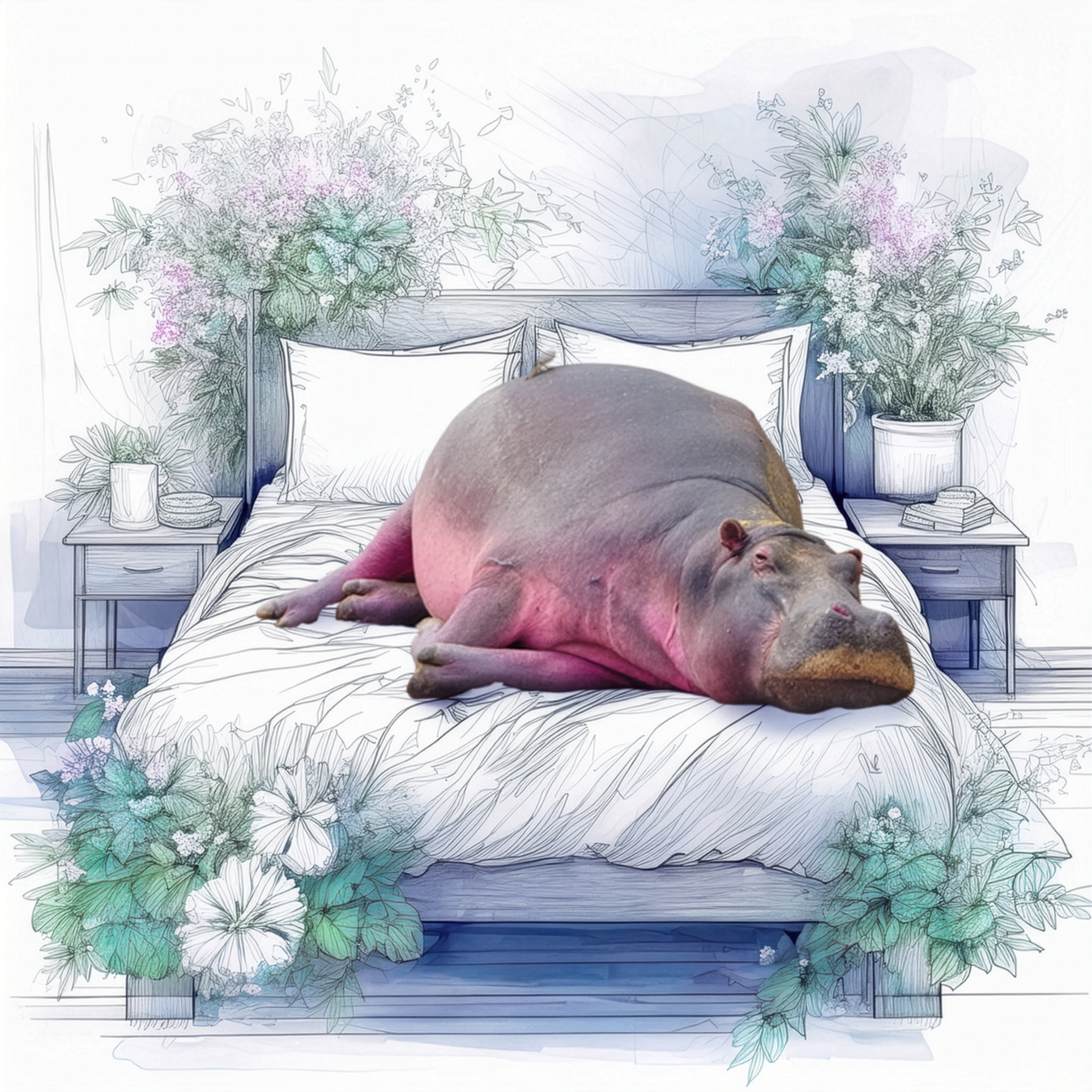 タンザニアのセレンゲティ国立公園のヒッポブールの水辺で熟睡中のカバ。その愛らしい姿をふかふかのベッドの上に寝かせてみました。「Nap time :お昼寝の時間」という言葉と共にお届けします。
