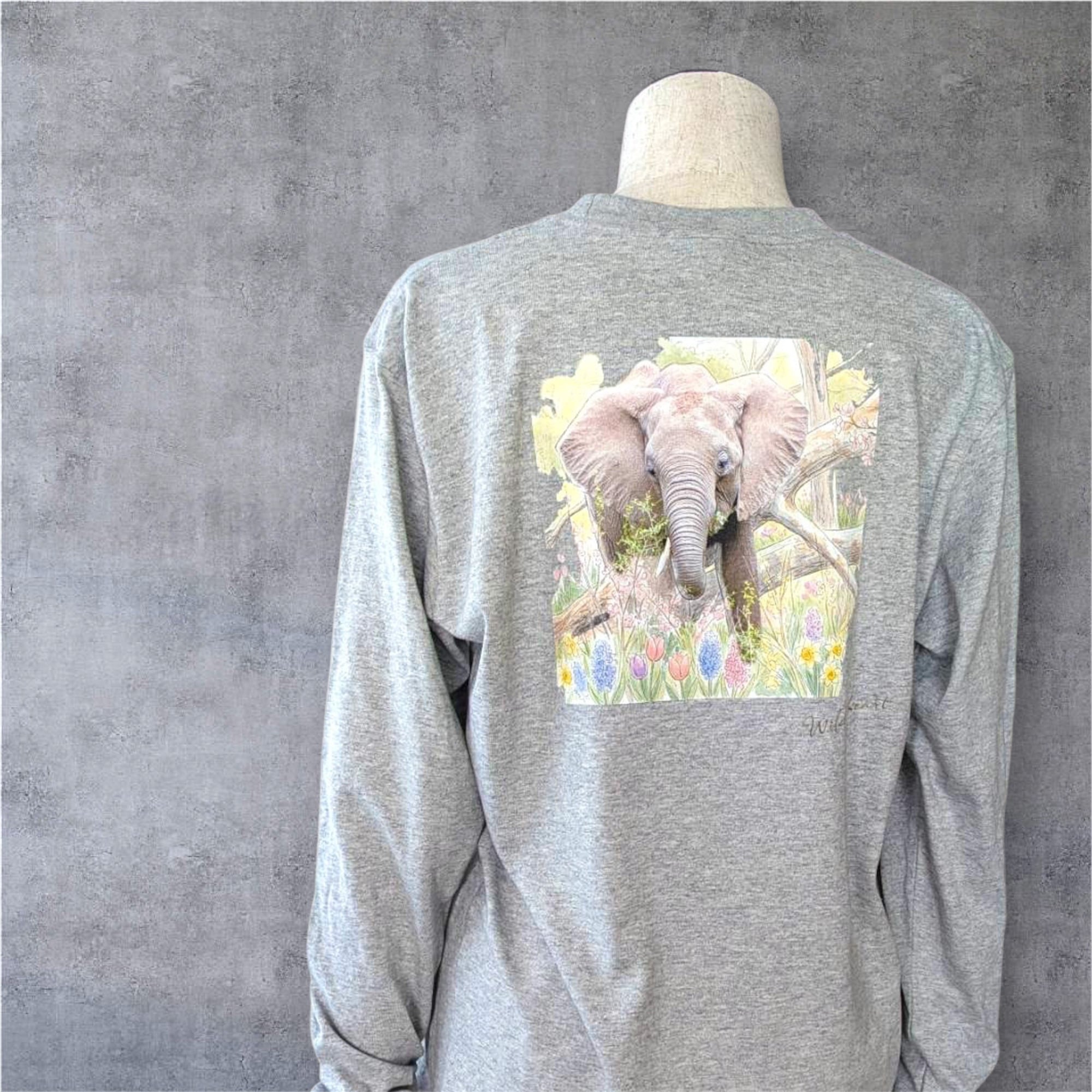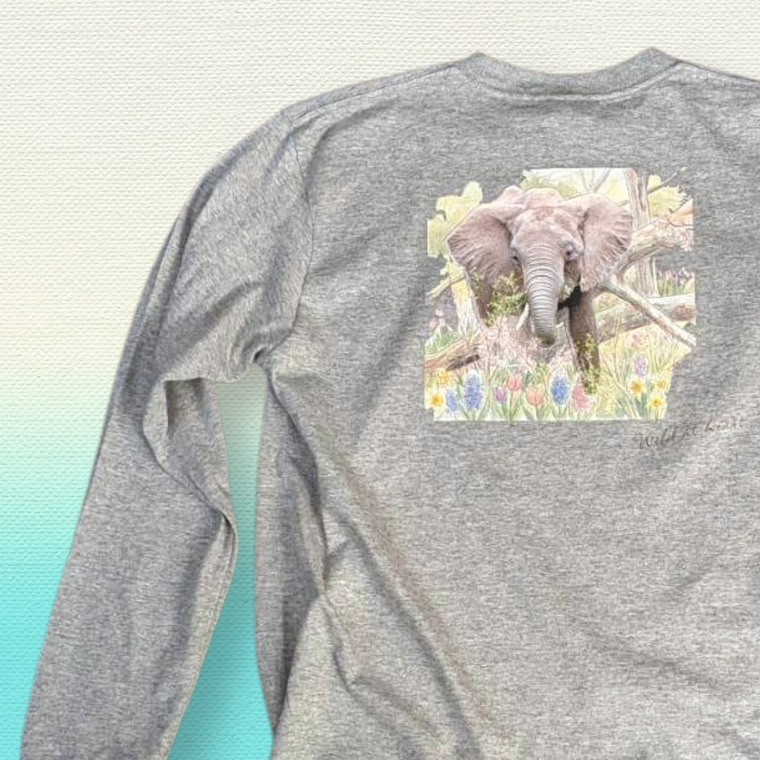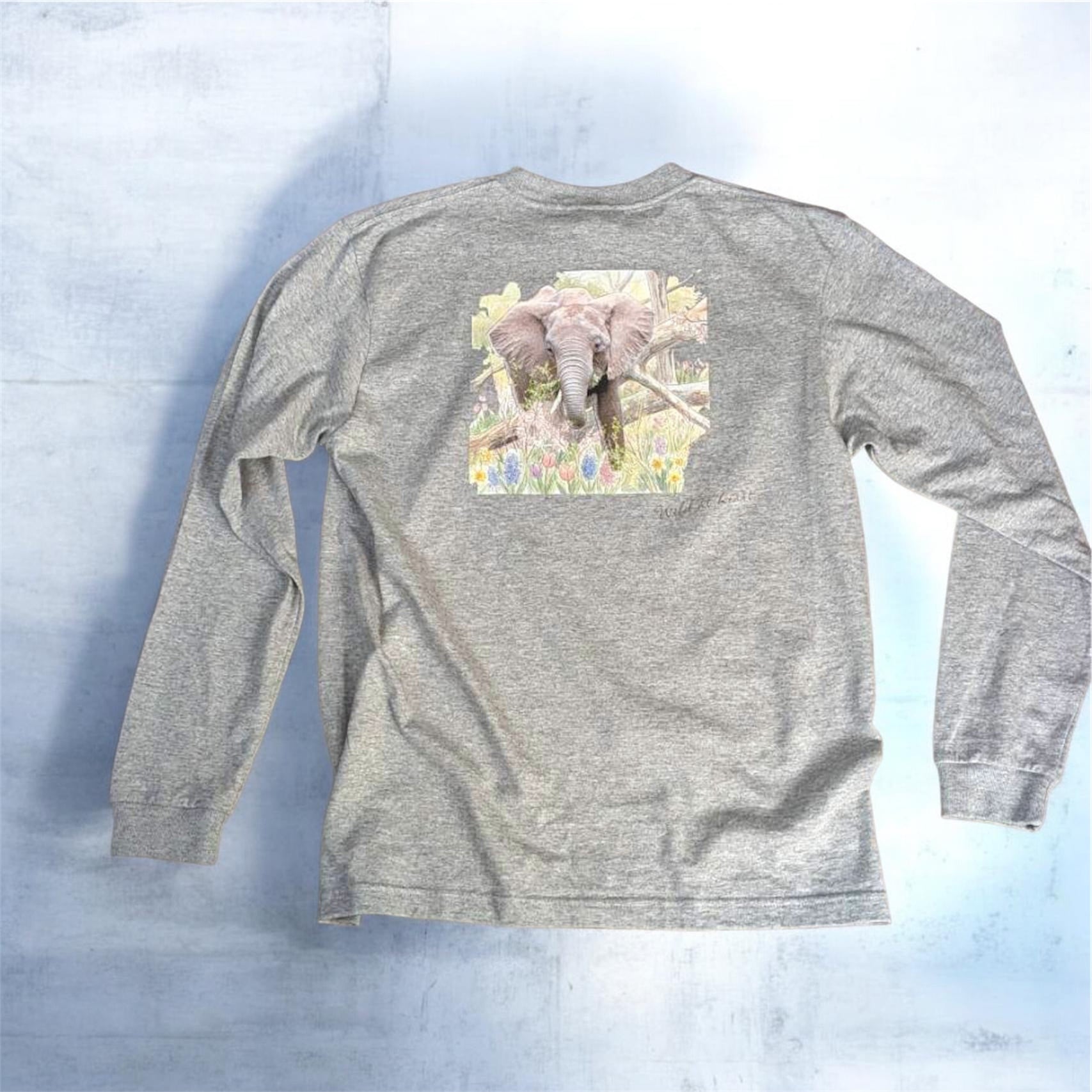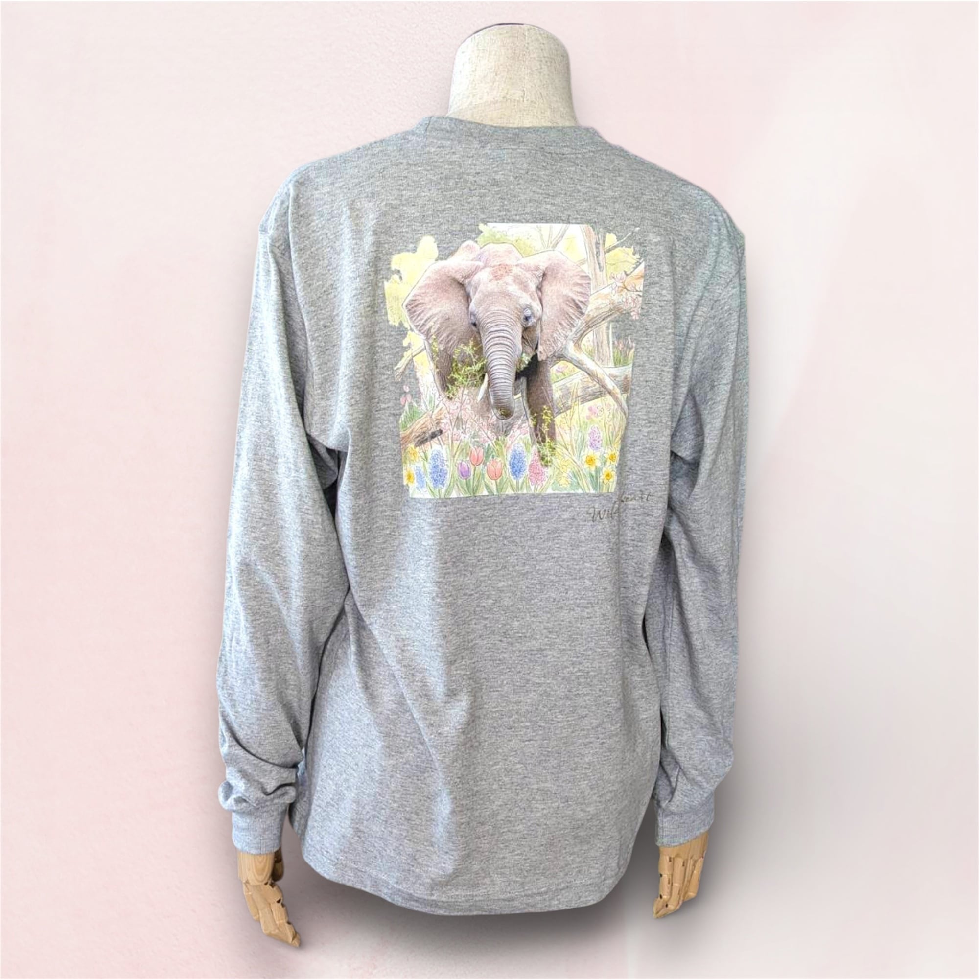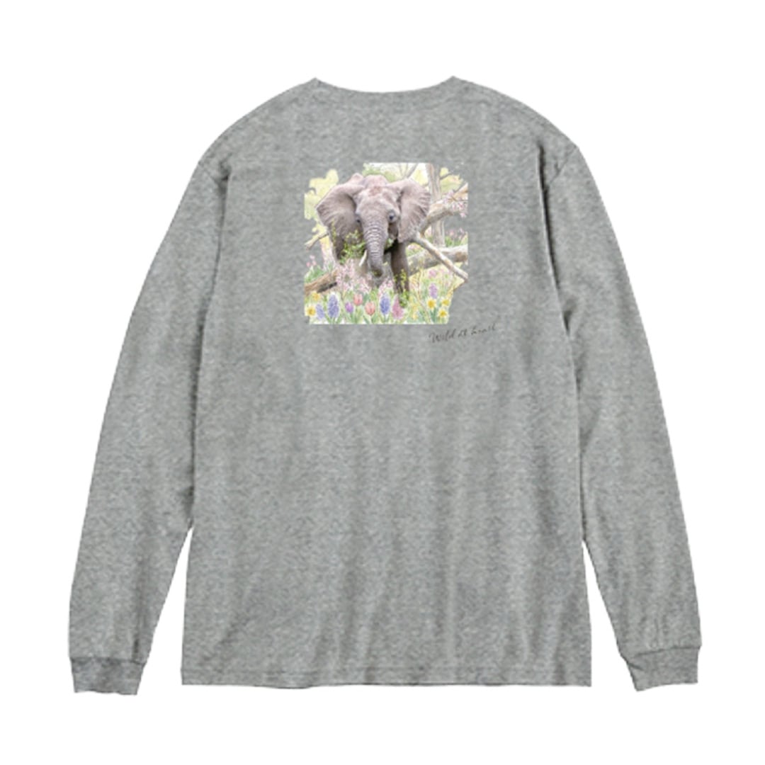 コットン80%長袖リブTシャツ アフリカゾウ バックプリント 杢グレー Printstar 5.6oz ヘビーウェイト