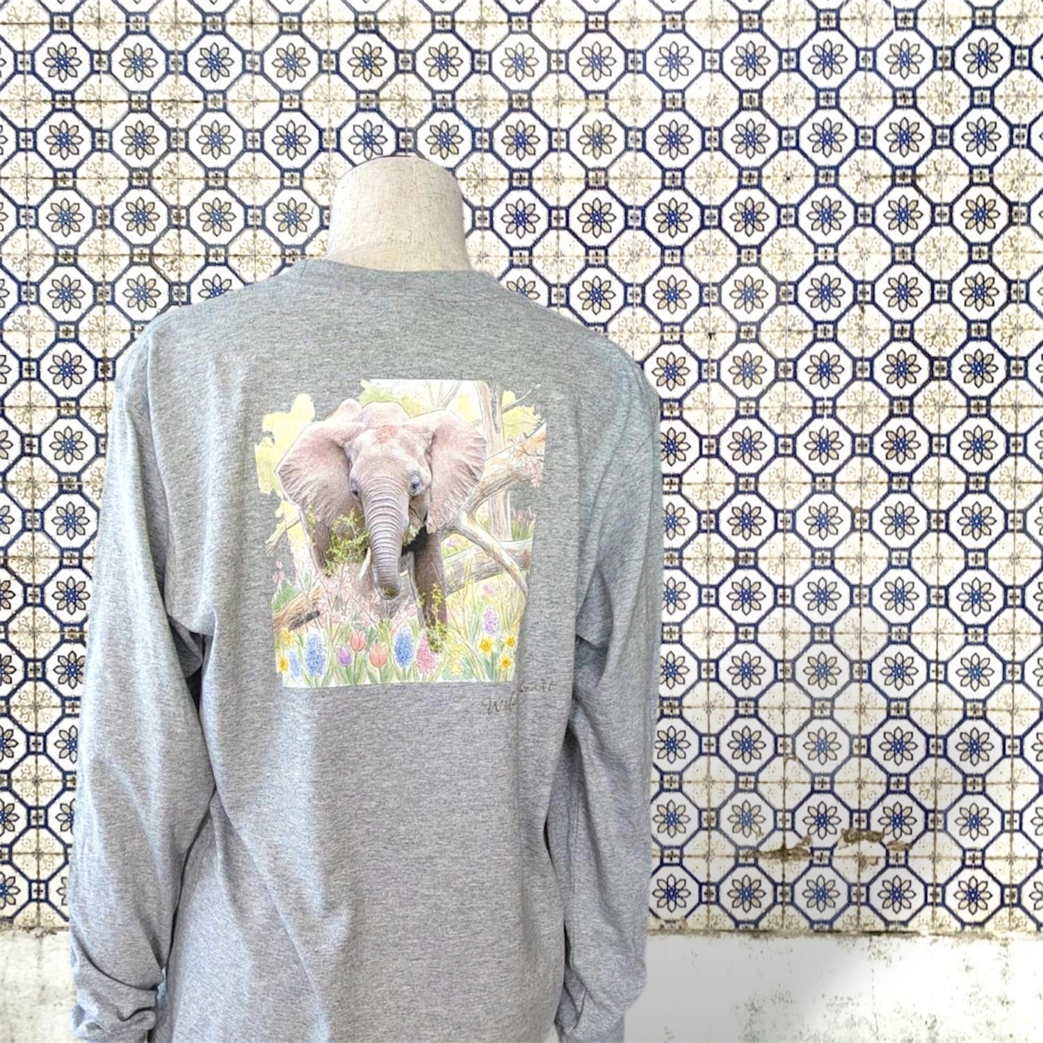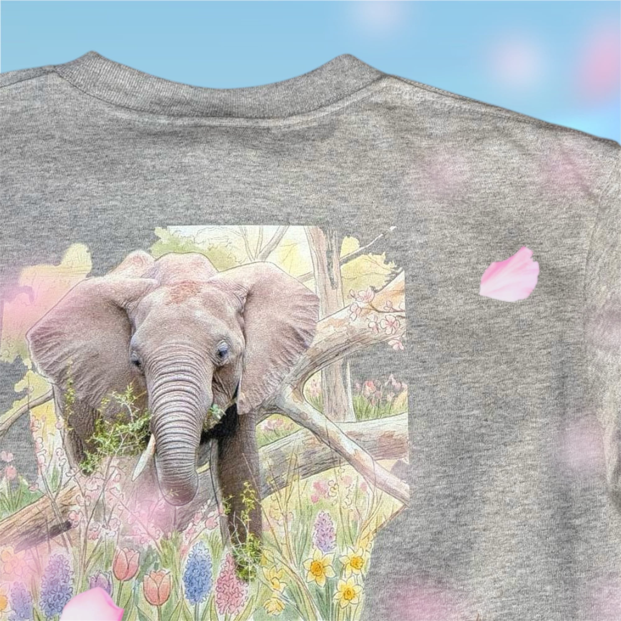 原画の息遣いを再建するために、「ホワイトインクジェット」を選びました。アフリカゾウの皮膚の質感や瞳の輝きなど、細部まで描き出された「着るアート」としてのクオリティを、是非実感してください。