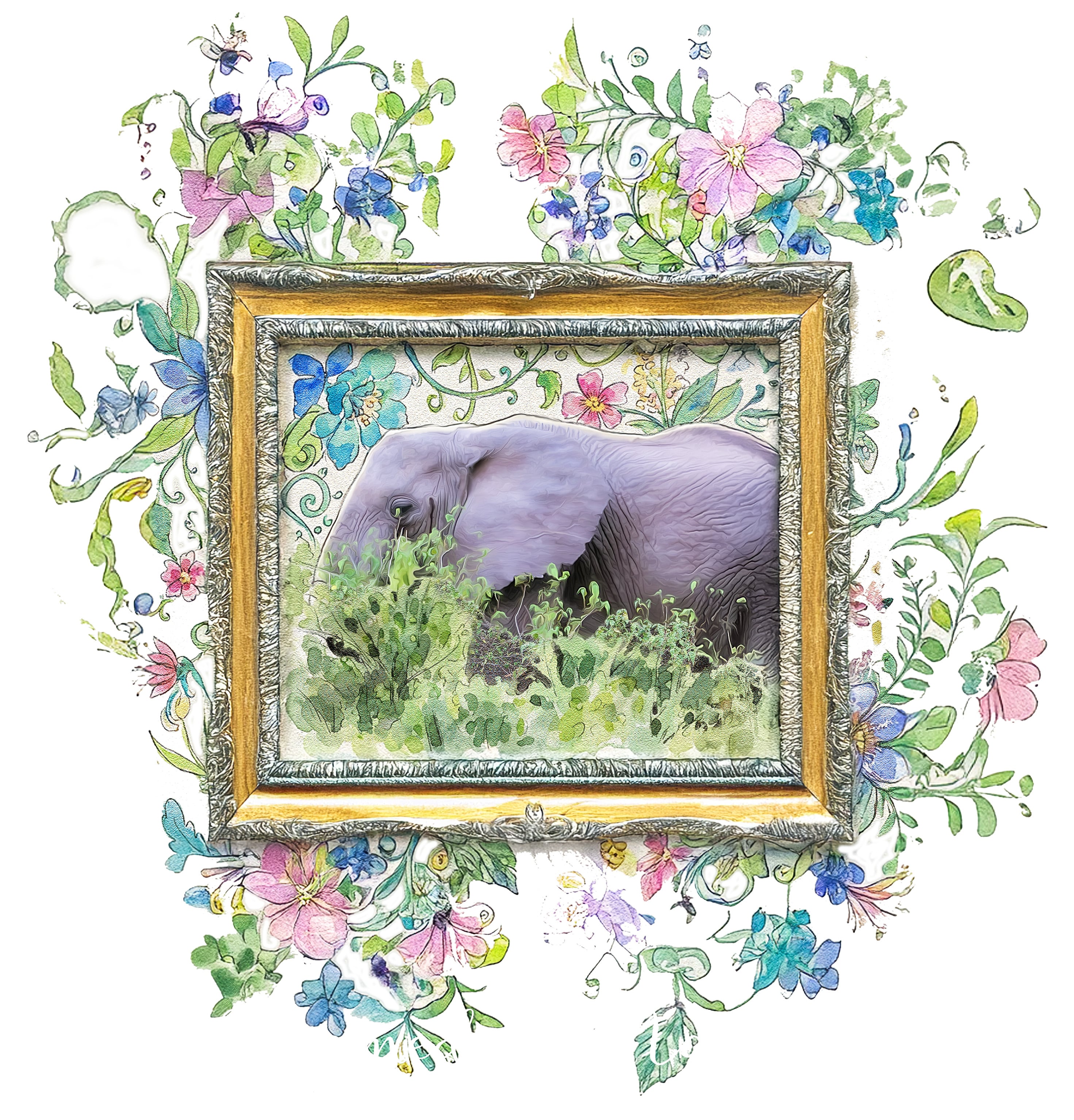 タンザニアのセレンゲティ国立公園でこちらを見つめるアフリカゾウのつぶらな瞳。その魅力的な表情を花で縁取られた額に収めてみました。「Framed by Nature: 自然によって額装された」という言葉と共にお届けします。