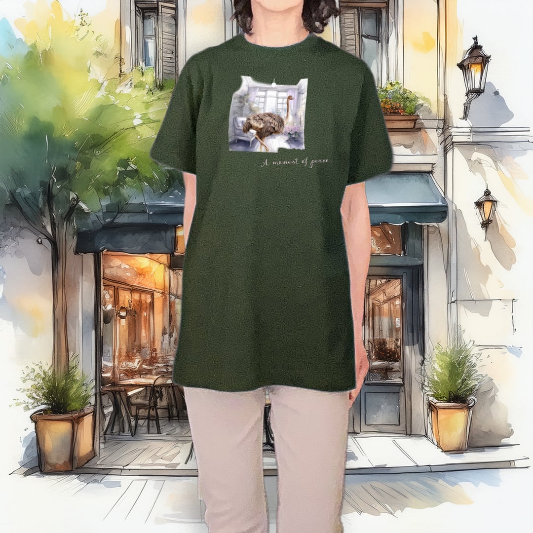 リビングに立っているダチョウのかわいらしいイラストは、着る人の個性を引き立てる特別な魅力があります。このTシャツを着ることで、日常のスタイルに遊び心を加え、友人や家族との会話をさらに楽しくすることができるでしょう!スミクロの色合いは、どんなコーディネートにもバランス良く合わせやすいのが特徴です。