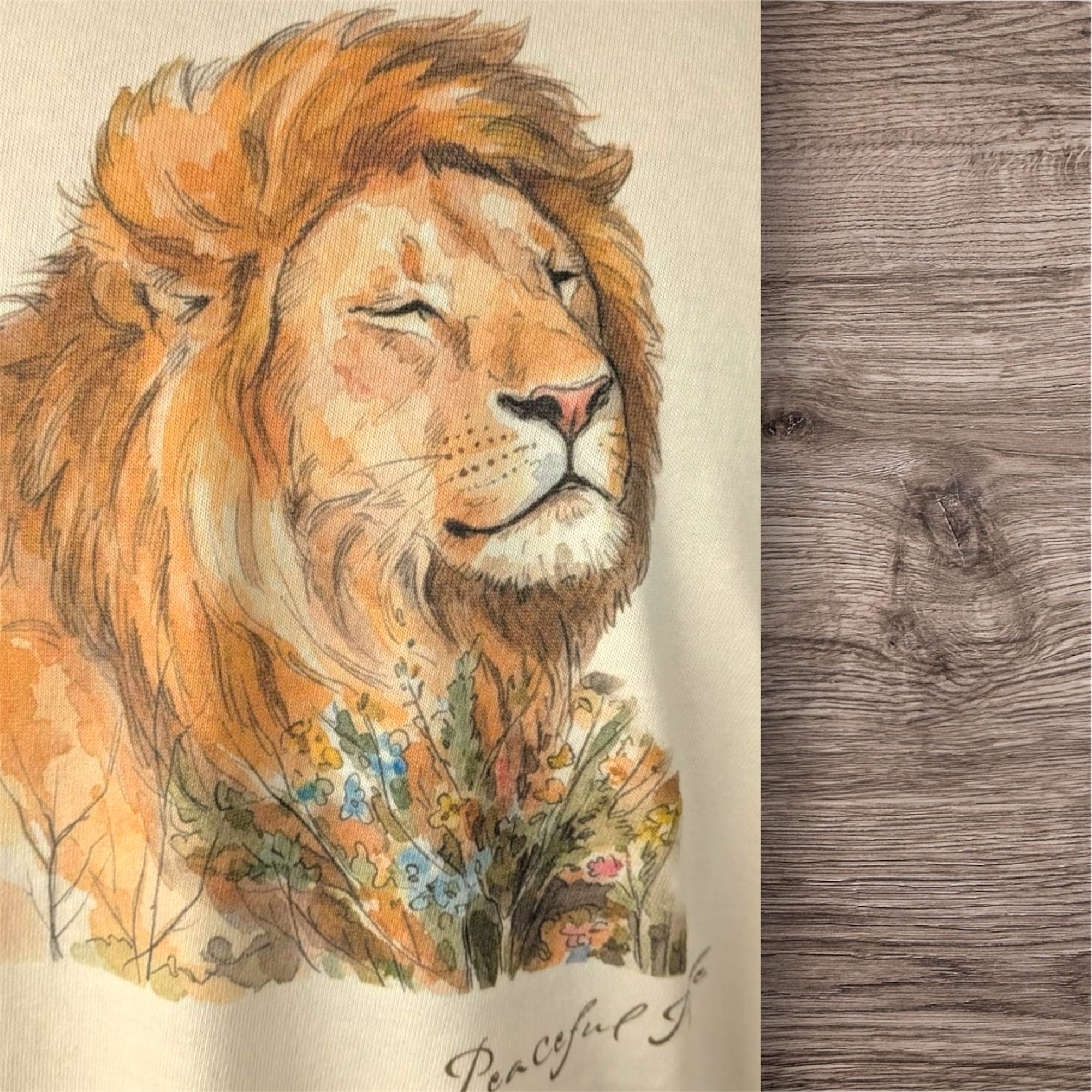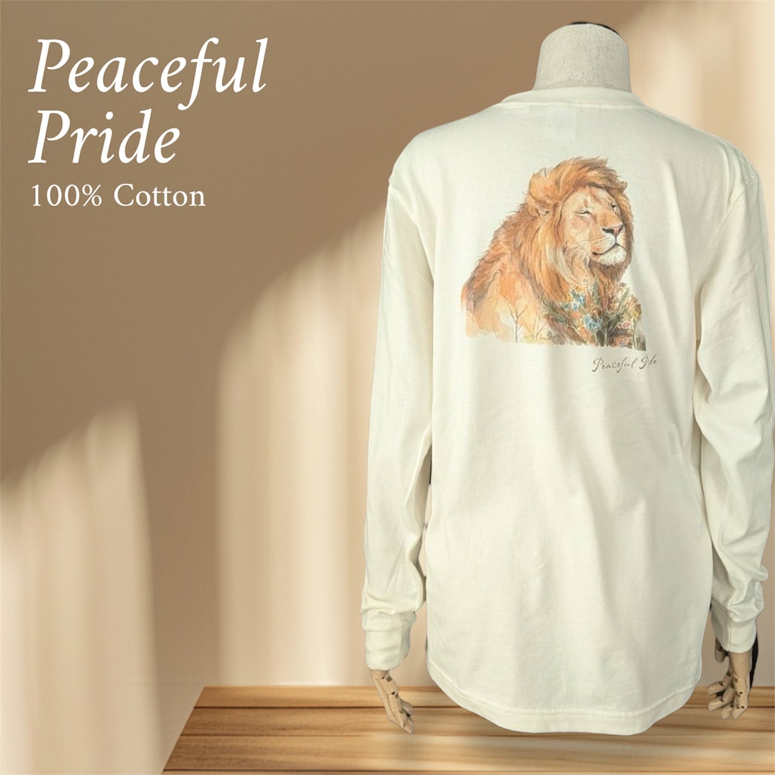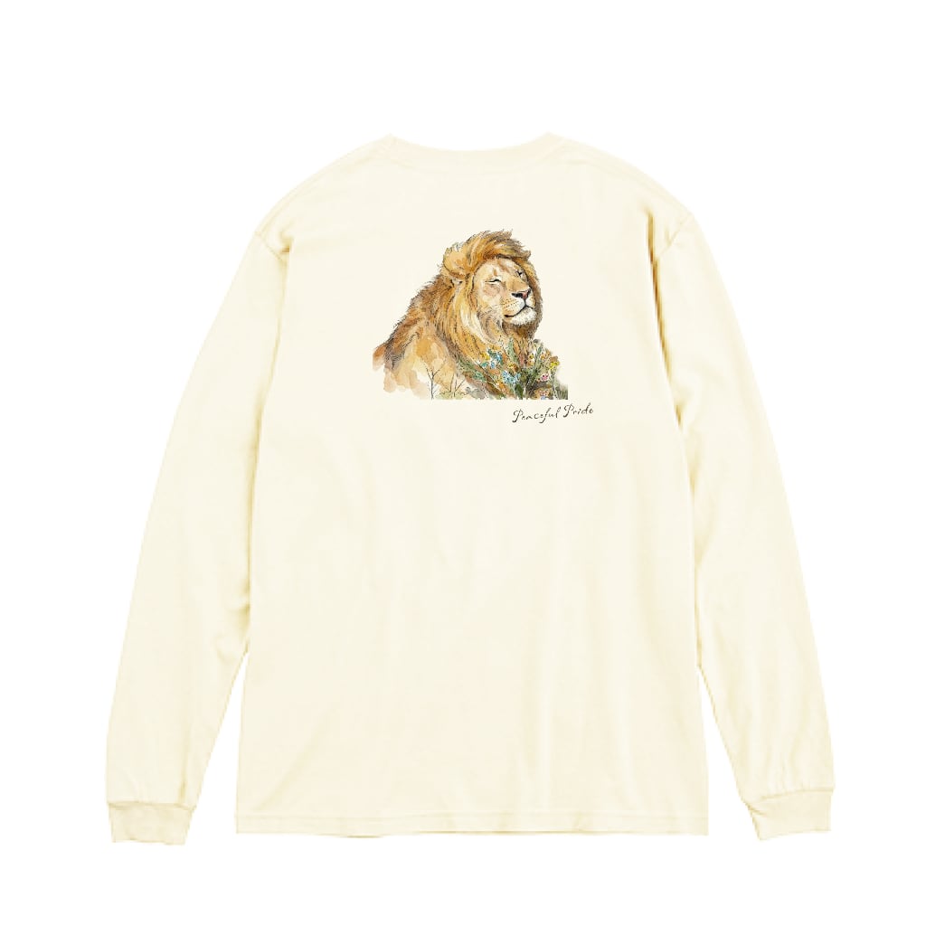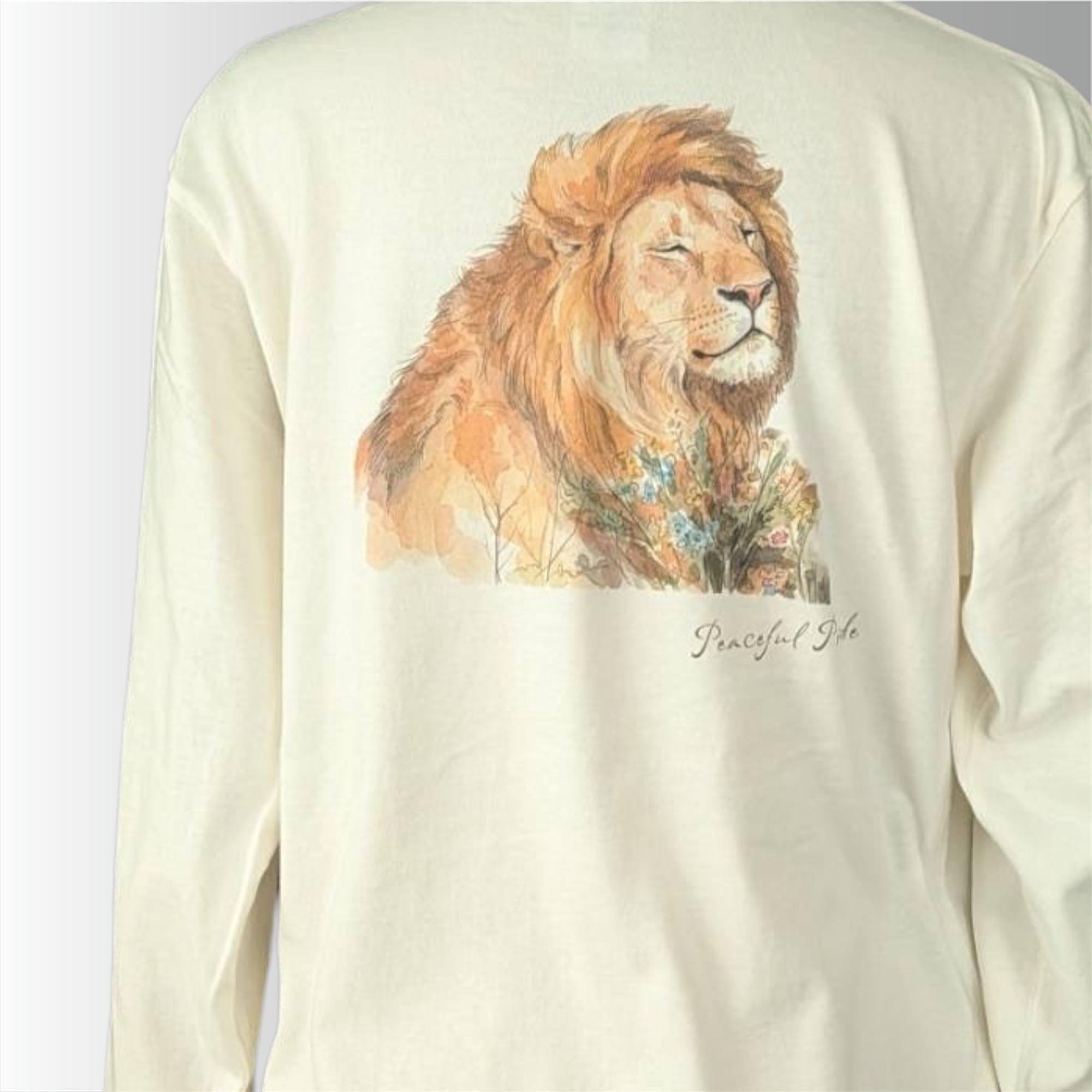 セレンゲティ国立公園に生息する勇敢なライオンのバックプリント。シンプルでありながら、力強い存在感を放つデザインです。「Peaceful Pride: 自分自身の内側にある揺るぎない自信からくる「静かな誇り」目を閉じ、風を感じてまどろむ姿は、厳しい自然界の中でも保たれる「心の平和」を象徴しています。忙しい現代を生きる私たちに、「時には目を閉じ、自分の中の平和(Peaceful)と誇り(Pride)を取り戻そう」というメッセージを届けてくれます。
