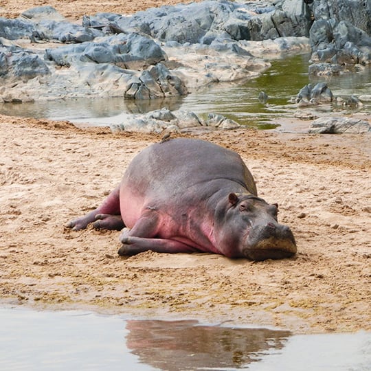 タンザニアのセレンゲティ国立公園のヒッポブールの水辺で熟睡中のカバ。その愛らしい姿をふかふかのベッドの上に寝かせてみました。「Nap time :お昼寝の時間」という言葉と共にお届けします。