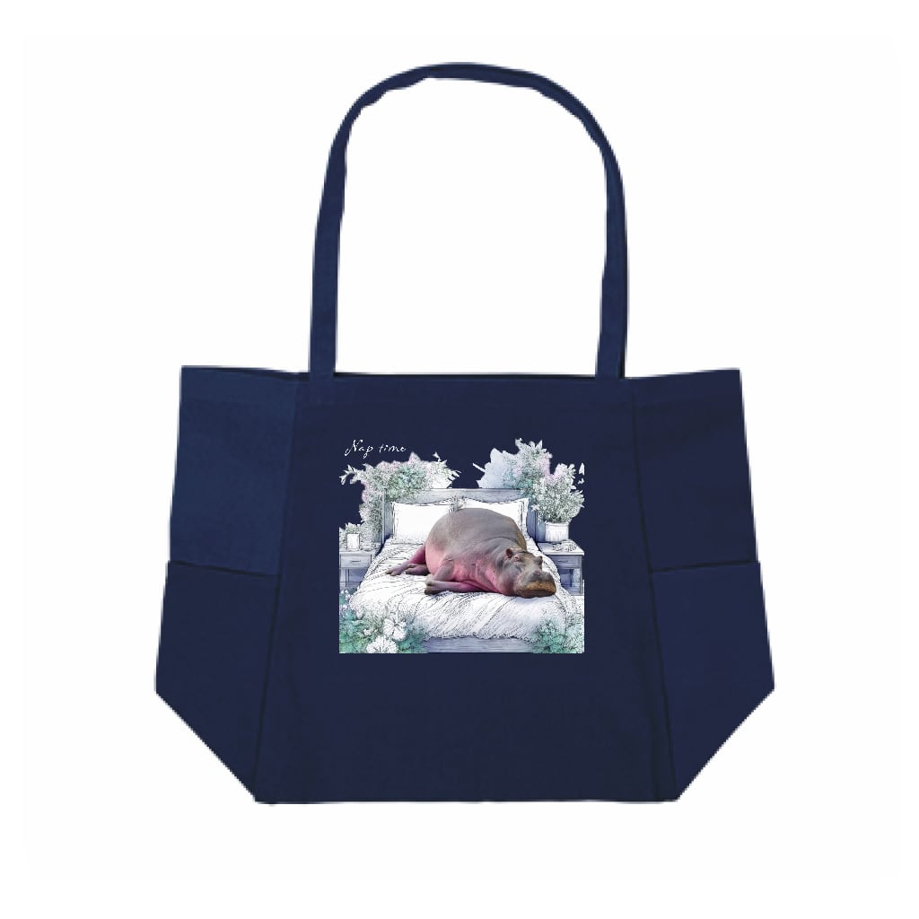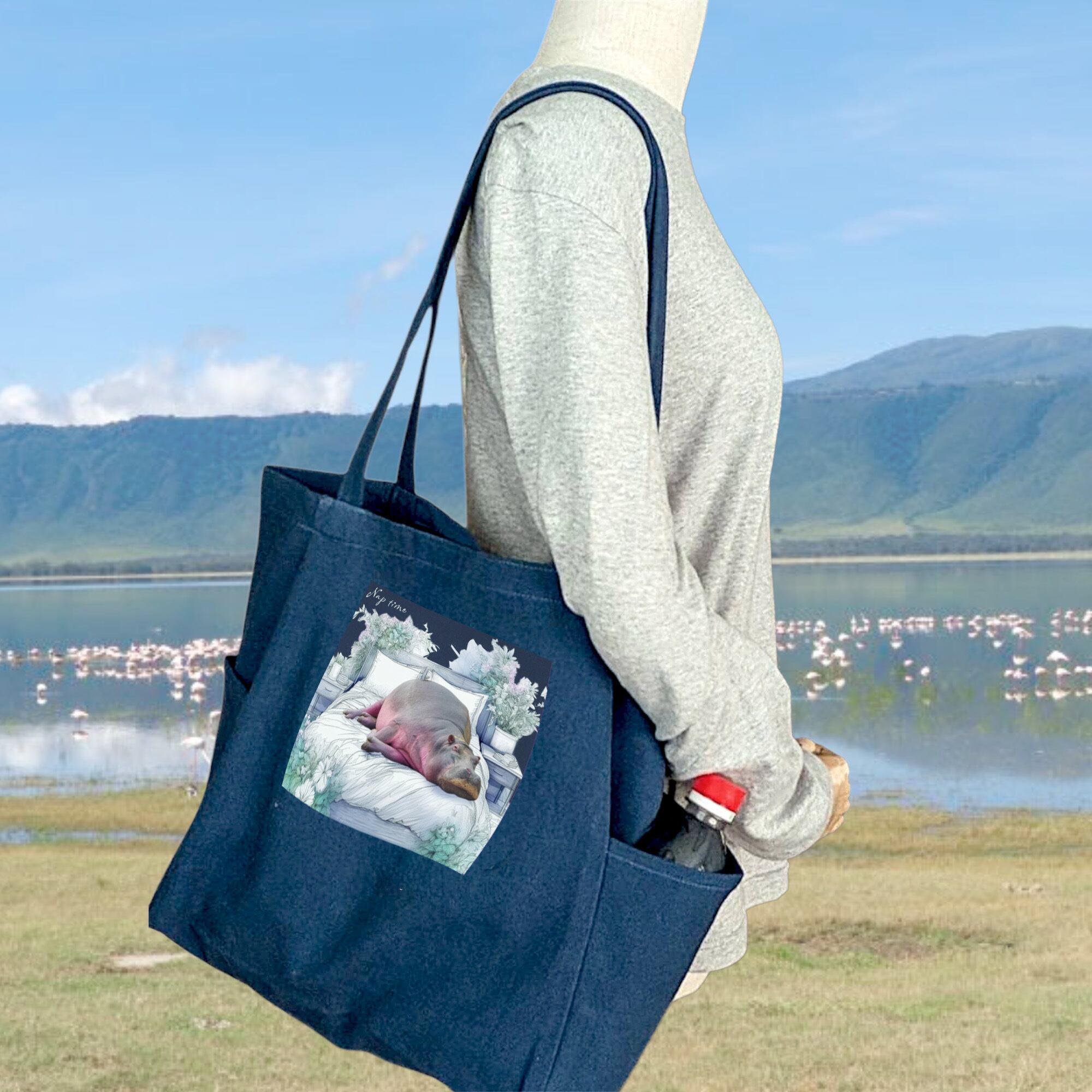 13oz ライトウォッシュキャンバスマルチトート ベッドで寝ているカバ コットンバッグ ネイビー