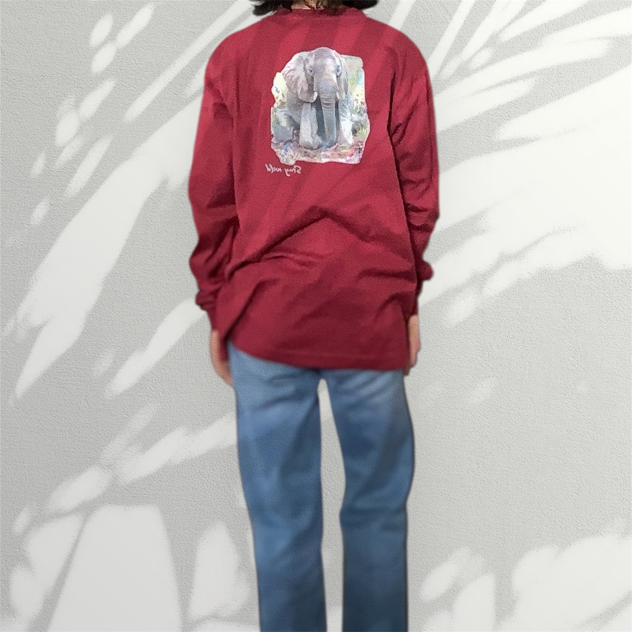 コットン100%長袖リブTシャツ 泥遊びをしているアフリカゾウ バックプリント バーガンディ Printstar 5.6oz ヘビーウェイト