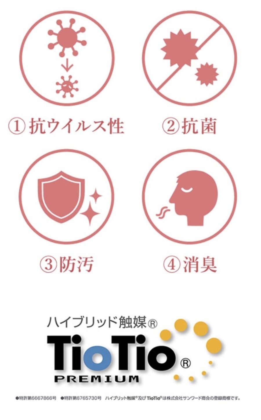 TioTioプレミアム加工とは、大阪大学産業科学研究所との連携研究契約によって生まれた多機能型触媒を使用した加工で、清潔に健康な暮らしを望む皆様のご要望に応える新たな加工技術として、大きな注目を集めています。