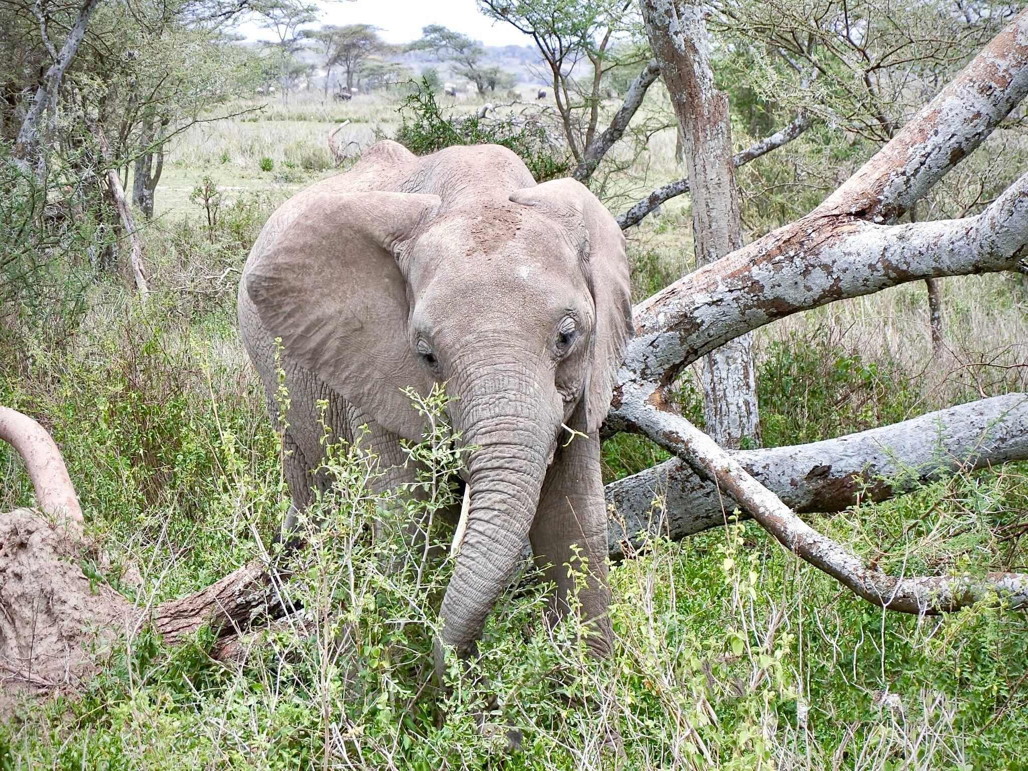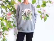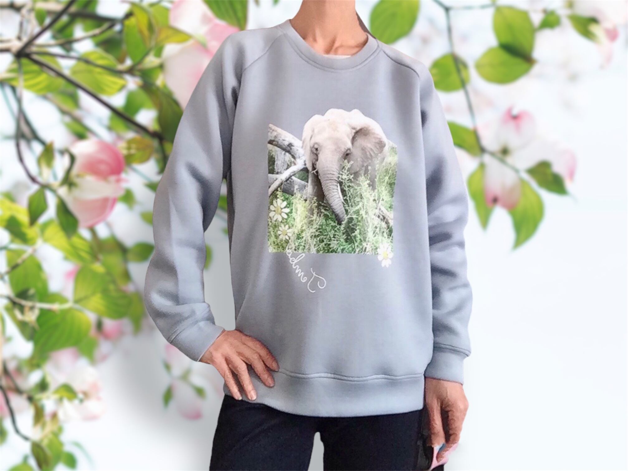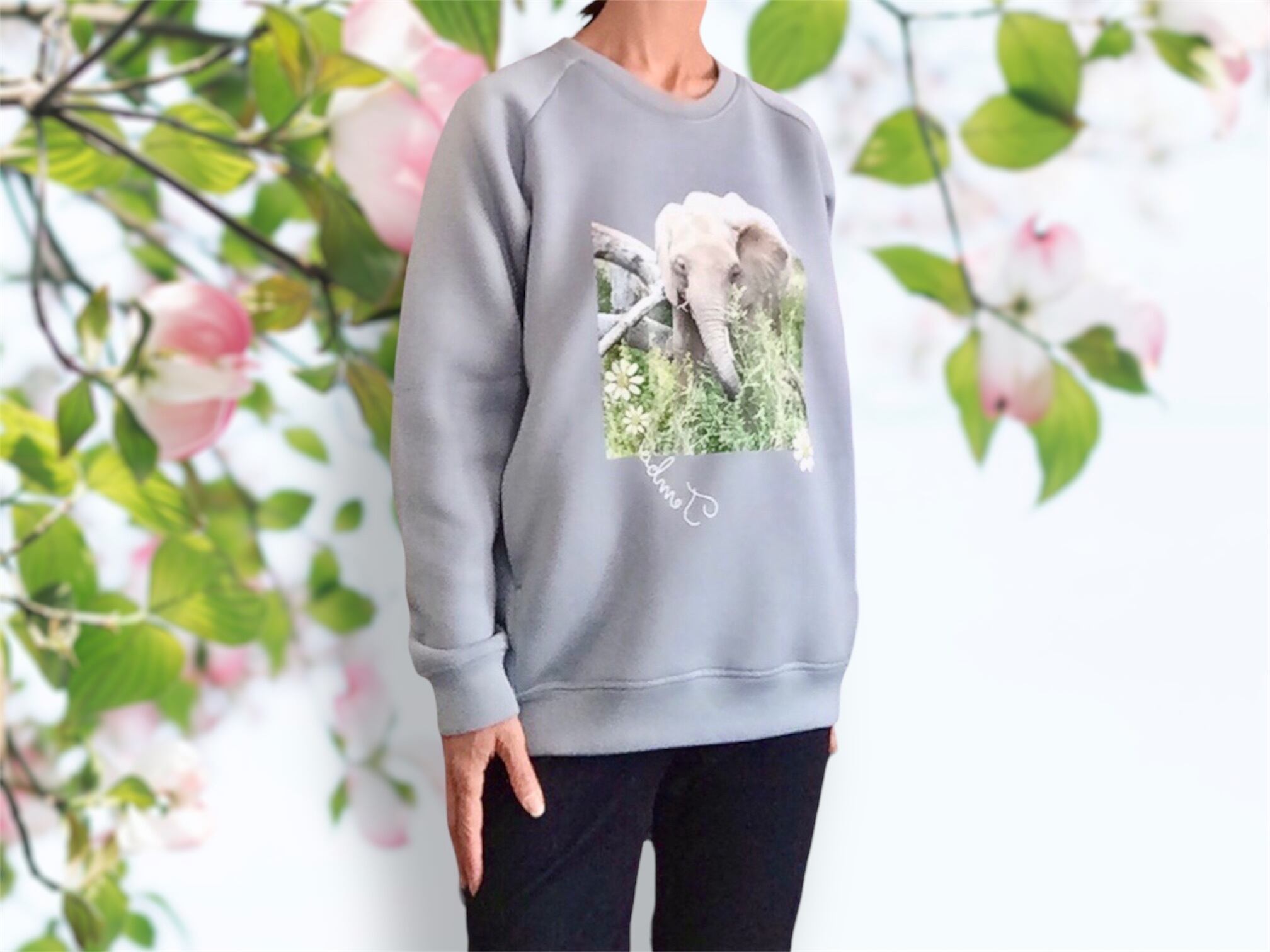 優しい顔をした野生のアフリカゾウが幸せそうに草を食べている姿に癒されます。スモーキーブルーとの相性も良く、優しい雰囲気のトレーナーです。
